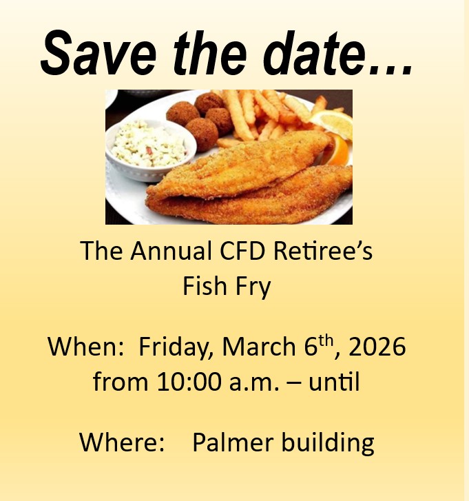 CFRS News (February Pay dates, Monthly meetings, New retirees)February 6, 2026Drop In (Captain Chad McIntosh) & CFRS Community Events (Retiree lunch)February 13, 2026 CFRS Community News (CFD Retirees Annual Fish Fry) February 10, 2026 Related postsFebruary 13, 2026Drop In (Captain Chad McIntosh) & CFRS Community Events (Retiree lunch)Read moreFebruary 6, 2026CFRS News (February Pay dates, Monthly meetings, New retirees)Read moreJanuary 26, 2026Drop In (Chief Pete Skeris)Read moreJanuary 4, 2026CFRS News (January Holidays, Pay dates, Monthly meetings, New retirees)Read more